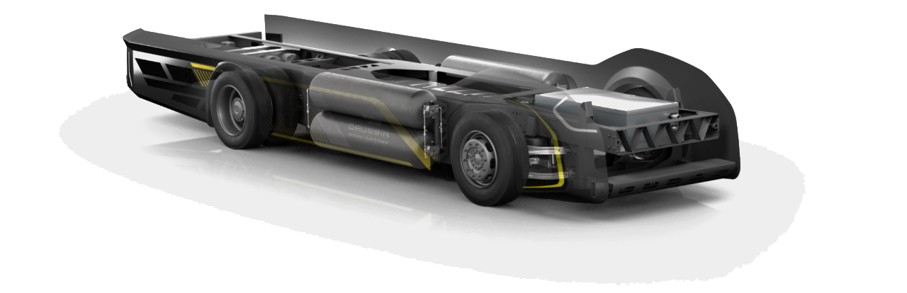 The vehicle platforms include an ultra-lightweight (400 kg) chassis with different lengths, heights and axle configurations, as well as hydrogen tanks, fuel cells, electric motors, transmissions, axles and suspensions.